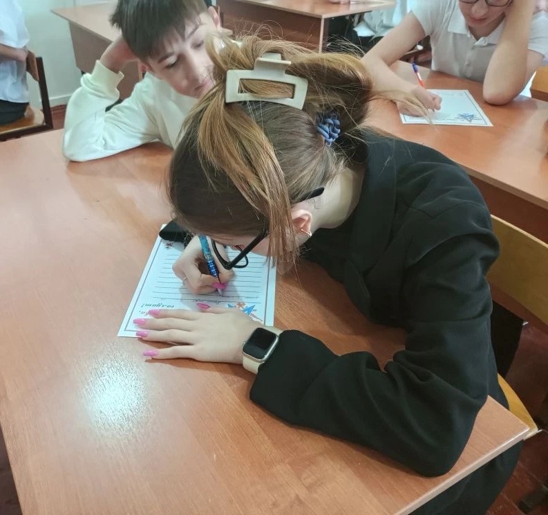Затем ребятам было предложено написать письма участникам специальной военной операции со словами благодарности и поздравлениями ко Дню защитника Отечества.
