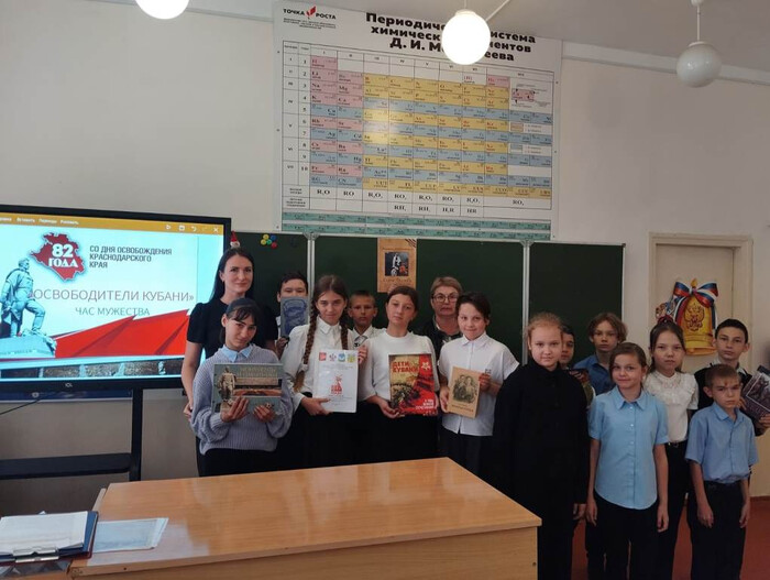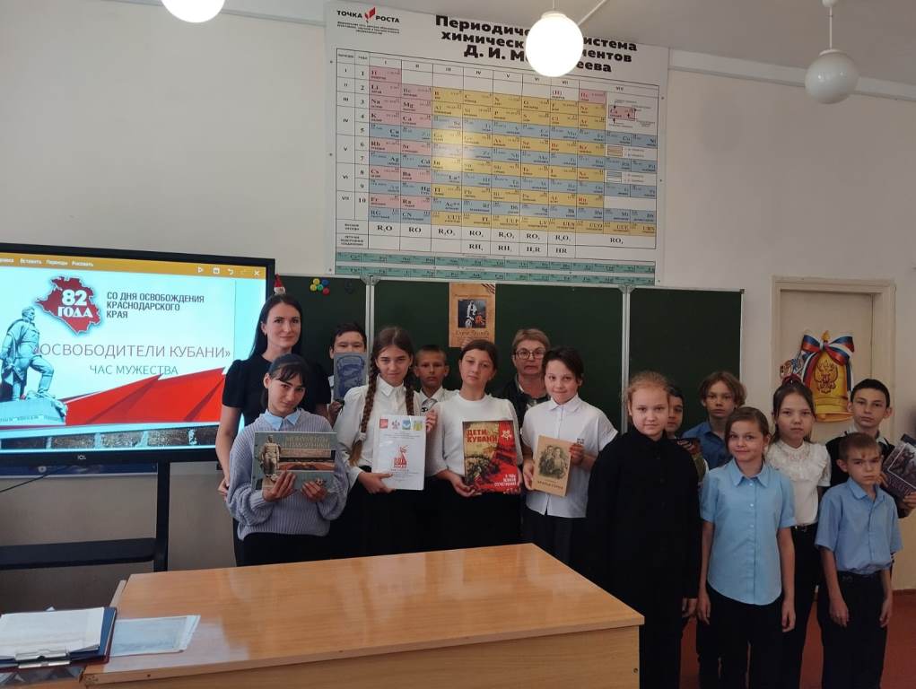 9 октября к 82-летию освобождения Краснодарского края от немецко-фашистских захватчиков и окончания битвы за Кавказ, в Октябрьской детской библиотеке, филиал № 2 был проведен урок мужества «Освободители Кубани». Участниками мероприятия стали учащиеся 5 классов МБОУ СОШ № 6. Ребята узнали много нового о событиях в период оккупации немецкими захватчиками родного края, об ожесточённых боях, проходивших в 1943 году на Кубанской земле, о вкладе жителей Кубани в Великую Победу. С помощью презентации ребята увидели документальные фотографии тех дней, памятники воинам – освободителям, познакомились с литературой по данной тематике, читали стихотворение Н. Веденяпиной «Освободителям Кубани».