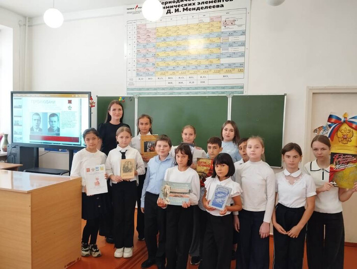 Особое внимание было обращено на героический вклад в победу над врагом жителей Крыловского района и ст. Октябрьской. Учащиеся познакомились с Героями Советского Союза Крыловского района, чьи имена увековечены в названиях улиц и школ Крыловского района, приняли участие в тематической викторине.